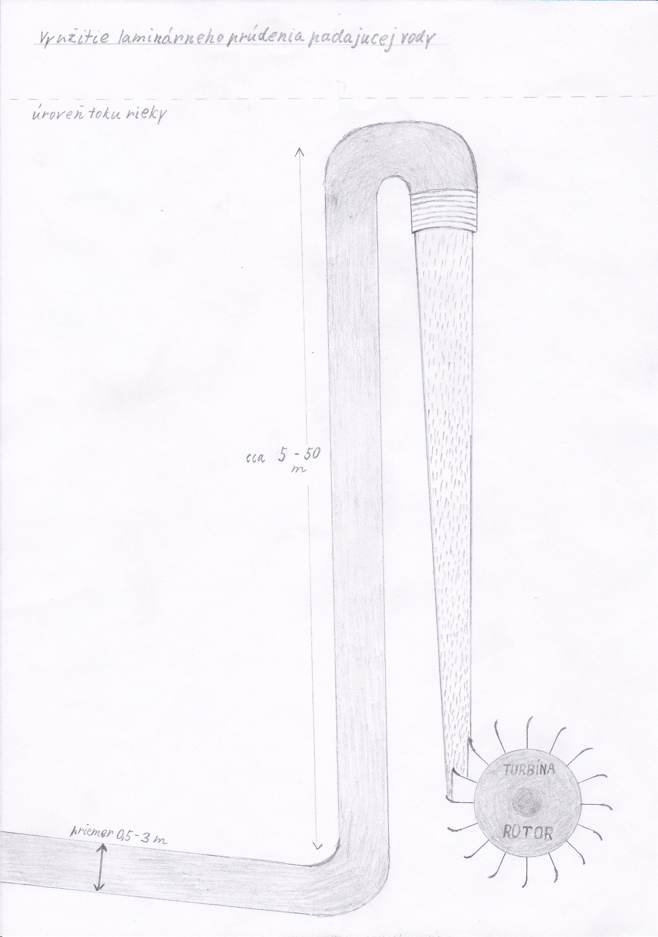 Pri nájdení vhodného toku nenápadne umiestnime pod hladinu zbernú časť odtokovej rúry, tzv. lievik. Samozrejme lievik musí byť chránený filtrom pred prienikom vodných živočíchov, väčších plávajúcich predmetov a iných nečistôt. Ďalšia časť potrubia bude umiestnená v zemi alebo na povrchu tak, aby splývalo s prostredím. Bude kopírovať terén, bez ohľadu na znížený tlak vody, ktorá v ňom preteká. Samozrejme, že výšku hladiny vtoku do potrubia nesmie potrubie ani v jednom mieste jeho vedenia prevýšiť, aby nedošlo k zastaveniu prietoku vody samospádom. Pri dodržaní tejto podmienky nie je prioritne podstatné kade potrubie povedie, koľkokrát a ktorým smerom bude ohýbané, ani aké bude dlhé. Podstatné je, aby bolo vedené k miestu inštalácie elektrárne s dostatočným prevýšením.